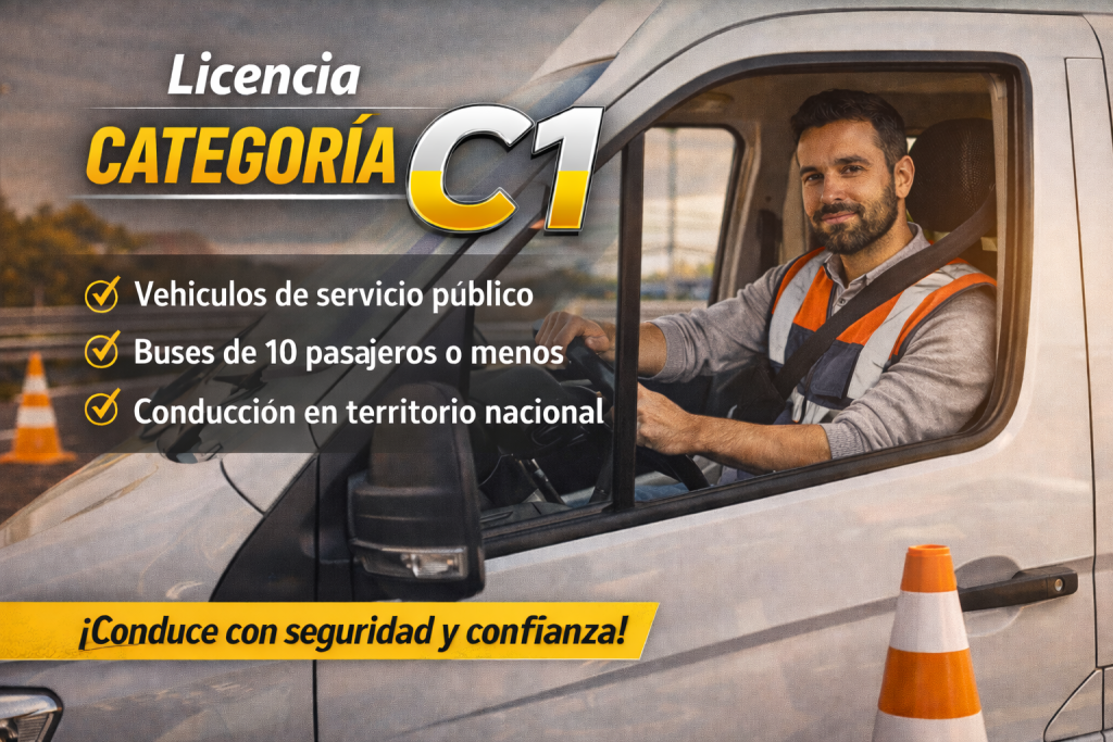 La licencia de conducción categoría C1 autoriza la conducción de vehículos de servicio público, tales como automóviles, camperos, camionetas y microbuses, así como vehículos de carga de servicio público (camiones y buses de menor capacidad), de acuerdo con la normatividad vigente en Colombia.